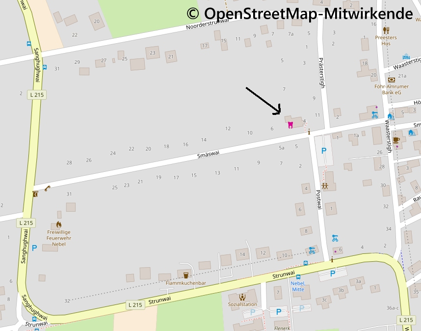 LageSo finden Sie mich im Smäswai 4. Die Karte ganz unten auf der Seite ist ein Service von Open Street Map (Ein Klick auf den Link führt auf deren interaktive Webseite). Der Praxiseingang befindet sich an der linken Seite des alten Pastorates. Sie finden hier auch Parkplätze für Autos und Stellplätze für Fahrräder. Falls Sie mit dem Bus kommen, schauen Sie auf den Busfahrplan der W.D.R. Der Bus fährt im Sommer jede halbe und im Winter jede Stunde. Sie steigen dann in "Nebel Mitte" aus, gehen Richtung Postwai (zum Watt hin), den Postwai bis zum Ende und stehen dann vor dem alten Pastorat. Der Praxiseingang befindet sich dann noch etwa 30 Meter nach links in den Smäswai hinein. Sie können auch mit der 3-Wort-Adresse (Forschte begehbar Teppich) navigieren. )
